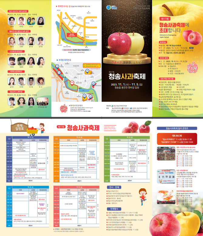 2023년도 청송사과축제는 11월 1일(수) ~ 11월 5일(일)까지 5일간 청송읍 용전천 현비암 일원에서 "청송사과, 찬란한 금빛 향연"라는 주제로 개최됩니다.