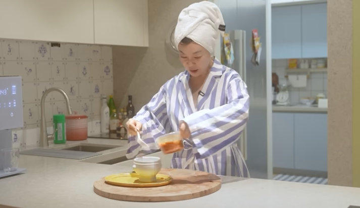 반신욕은 일주일에 두세 번 꾸준히 하며, 피부와 몸무게 유지에 도움이 된다며 캔들을 켜고 휴식을 위해 콤부차를 준비해서 긴장과 피로를 푼다고 합니다.