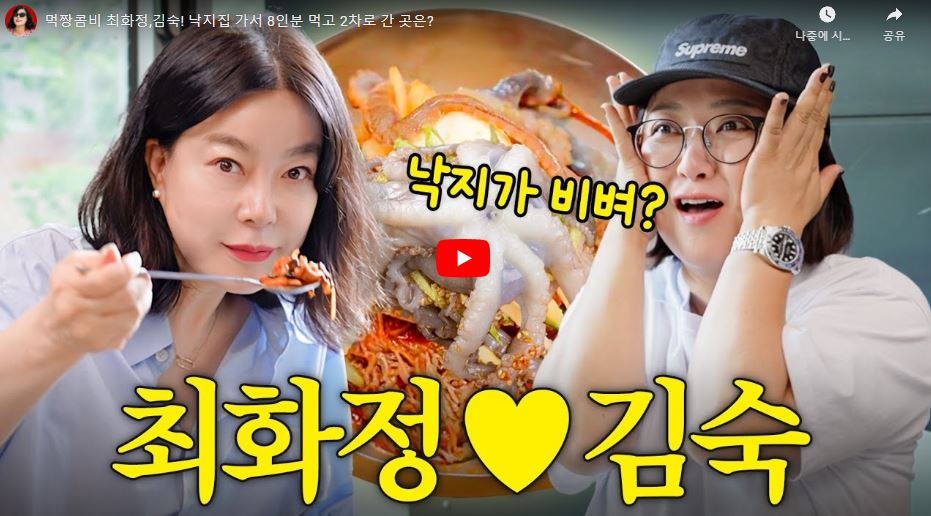 최화정과 김숙이 무교동 유정낙지에서 만나 20년 우정과 처음만날을때 첫인상과 음식에 대해 서로 추억을 공유합니다. 최화정의 유튜브가 50만이 되면 함께 식사를 하자고 했는데 김숙은 3년이 걸린것을 최화정은 3개월만에 50만 구독자가 되어 축하하는 식사자리입니다.
