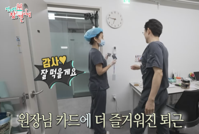 이어 한상보 원장님께서는 직원들과 함께 난리 나는 점심 식사 시간을 가지셨습니다. 그 가운데, 원장님께서는 8년의 인연을 이어오고 있는 매니저로부터 청첩장을 받으셨고, 평소에도 '애처가'로 알려진 원장님께서 매니저에게 결혼하지 말라는 충격 발언을 하시며 현장을 초토화시키셨습니다. 또한, 원장님께서는 직원 복지를 위해 층마다 한도 없는 개인카드를 놓아두셨으며, 통 큰 경조사비를 비롯해 퇴근하는 직원들에게 고민 없이 카드를 내미시며 독보적인 복지를 공개하셨습니다.
