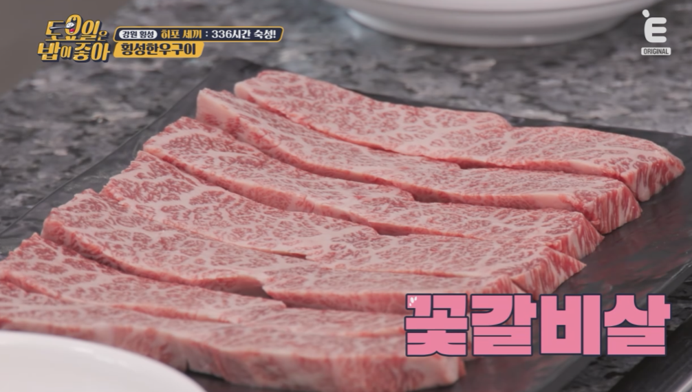 마블링 좋은 부위만 엄선한 꽃갈비살 히밥이 먹은 한우 중에 제일 맛있다고 합니다. 씹을 수록 입에 촥 감기는 식감