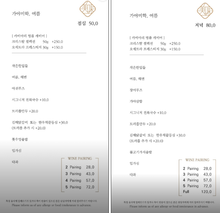 전복 내장과 들기름으로 맛을 낸 꾸덕한 전복 국수부터 한우 채끝 수제디저트까지 정갈함과 고급미로 업그레이드한 한식 요리를 풀코스로 맛보실 수 있습니다.