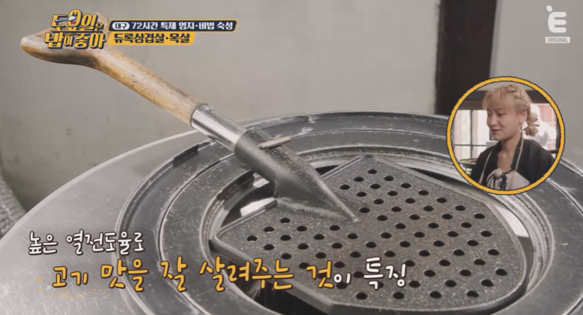 찜질방 숯가마 삼겹살에서 착안 특별 주문 제작한 삽 모양 불판