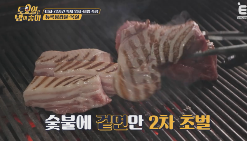 유기농 알밤을 먹고 자란 듀록 흑돼지를 사용해서 우수한 마블링을 부드럽고 담백한 맛이 일품입니다. 비법 숙성 후 2차 초벌해서 고기가 나옵니다.