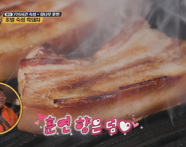 목살 오겹살이 초벌해서 참나무 향을 먼저 입혀서 나오면 불판위에 고기를 올립니다. 30% 익혀서 나오면 자리에서 불에 구워서 드시면 됩니다.