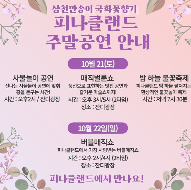 주말에는 버블쇼, 사물놀이, 음악회 등 매주 다양한 이벤트를 진행한다. 피나클랜드 내부의 카페 드 피나클에서는 국화차, 국화유자차, 국화쌍화탕 등 특별메뉴와 함께 먹거리장터에서는 가을 대하, 전복축제가 진행된다. 볼거리, 먹을거리, 즐길거리 가득한 피나클랜드에서 가을을 즐겨보자.