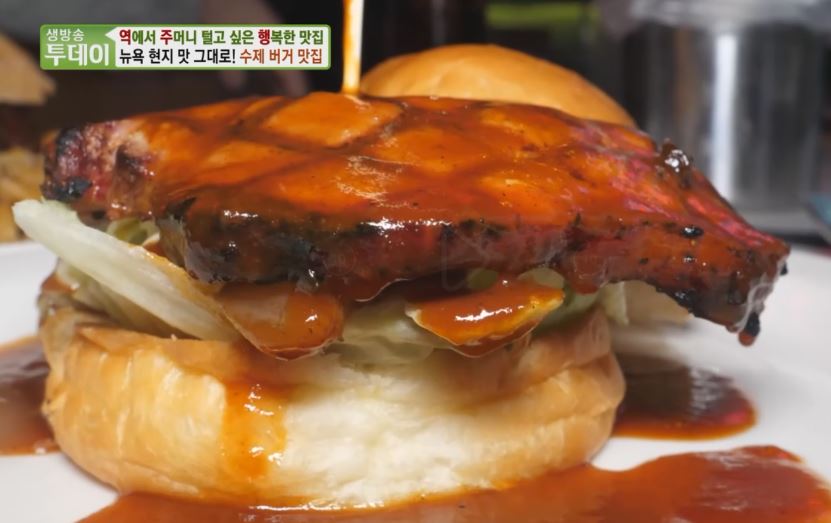 겉은 바삭하게 속은 부드럽게 만들어낸 진정한 버거 파티 통갈비 위에 치즈를 올린 등갈비 버거 잘 익은 스테이크 위에