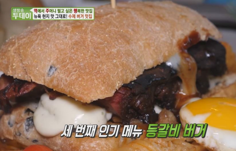 겉은 바삭하게 속은 부드럽게 만들어낸 진정한 버거 파티 통갈비 위에 치즈를 올린 등갈비 버거 잘 익은 스테이크 위에