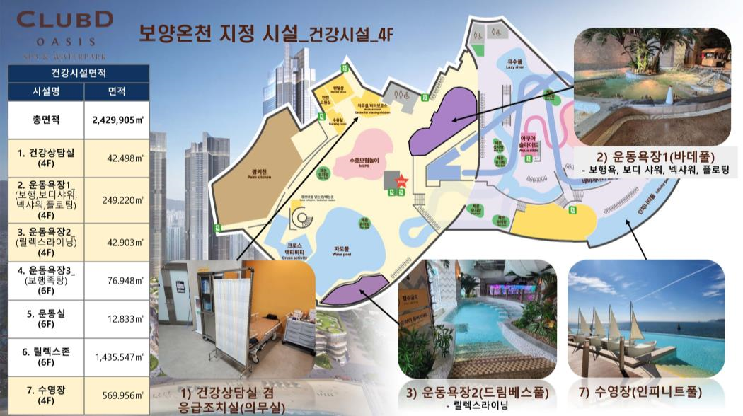 | 시설기준 | - | ㅇ건강시설 - 건강상담실(응급조치실), 운동욕장, 운동실, 릴렉스존, 수영장 ㅇ기본시설 - 프론트로비, 탈의실, 온천욕장, 사우나실, 찜질방, 노천탕, 다목적홀, 식당 ㅇ부대시설 - 숙박시설(또는 근접거리 이용가능), 의료시설(또는 제휴 이용 가능) |