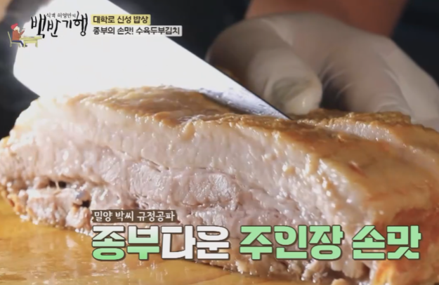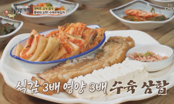 신성은 수육과 김치를 한입먹고 그리웠던 돼지고기 기름의 맛에 녹습니다.