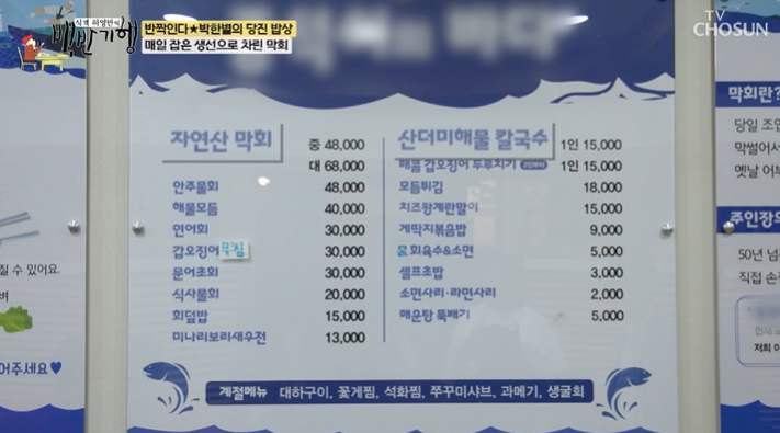 이곳은 싱싱한 자연산 막회와 산더미 해물칼국수가 대표 메뉴예요.