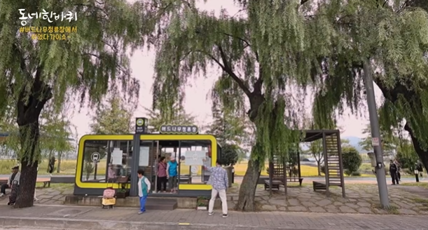 드라마 속 한 장면처럼, 오래된 버드나무와 함께 있는 작은 정류장.