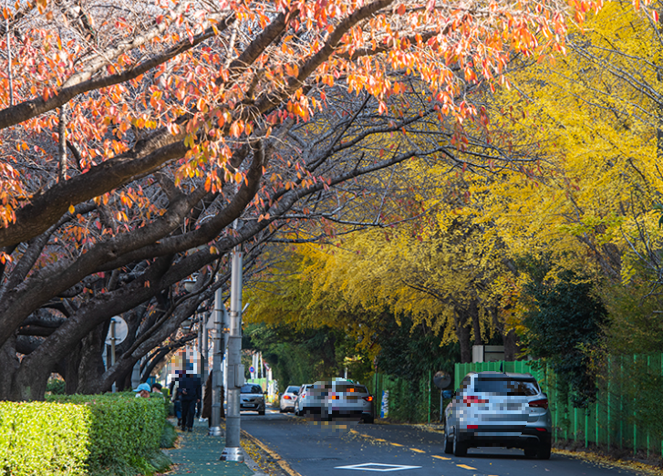 노란 은행잎이 흩날리는 도심 속 가을길.