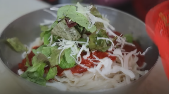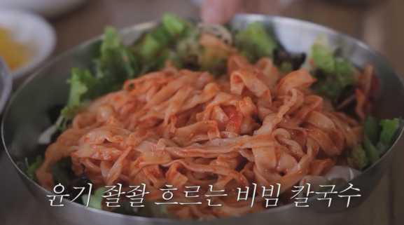 윤기 자르르~ 새콤달콤한 냄새가 일품인 이 메뉴는 마치 쫄면 소스와 비빔국수 소스가 섞인 듯한 독특한 풍미를 자랑했어요. 보기만 해도 군침 도는 비주얼!
