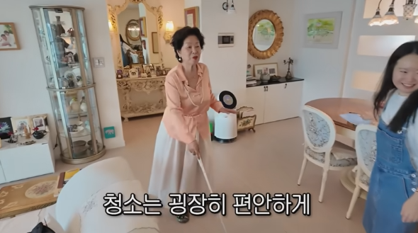 데이트 전에 집안 청소도 빠질 수 없죠! '몬스터겔 돌이'라는 청소 도구를 이용해 허리를 굽히지 않고도 먼지를 쉽게 제거하는 꿀팁을 전수해주는 선우용여 님. 현실적인 노하우가 돋보입니다.