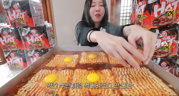 쯔양은 열라면에 영양군의 다양한 특산물을 곁들여 색다른 조합 먹방을 선보였습니다.