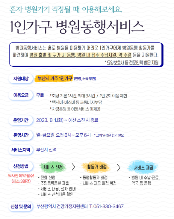 부산시 건강가정지원센터는 20238월부터 부산시에 거주하는 1인 가구를 대상으로 '1인가구 병원동행 서비스'를 시범 운영합니다.