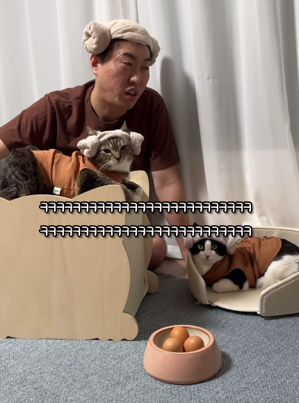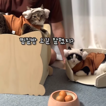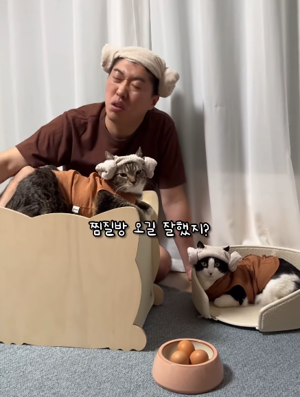 아빠가 씻지 않는다고 놀려도, 심지어 계란을 춘봉이 머리에 치는 듯한 상황극에도 덤덤하게 대응하는 춘봉과 첨지의 모습은 그야말로 귀여움 그 자체입니다. 찜질방 상황극 자체도 유쾌하고 재미있어 웃음을 자아냅니다.😊🐱