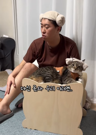 양머리를 한 모습은 너무 귀엽고, 아빠가 상황극을 펼쳐도 무시하지 않고 묵묵히 자리를 지키는 모습은 100만 유튜브 구독자를 자랑하는 고양이의 품격을 보여줍니다.