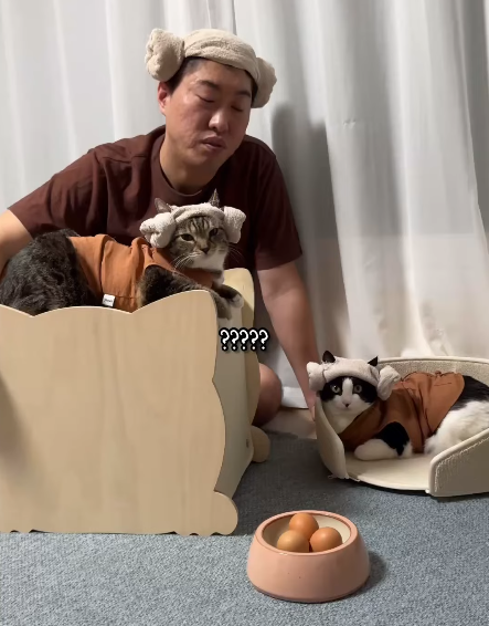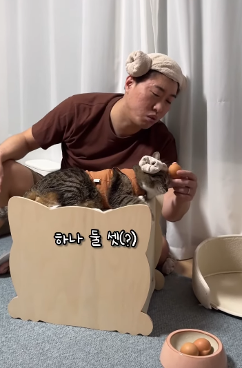 양머리를 한 모습은 너무 귀엽고, 아빠가 상황극을 펼쳐도 무시하지 않고 묵묵히 자리를 지키는 모습은 100만 유튜브 구독자를 자랑하는 고양이의 품격을 보여줍니다.