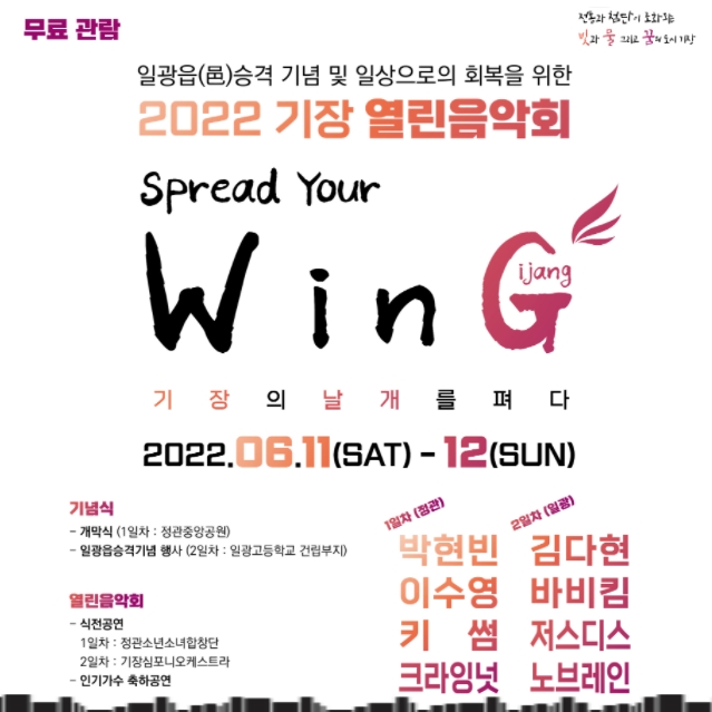 2022 기장 열린음악회가 3년 만에 개최됩니다. 매년 다른 주제로 기장 군민들과 함께하는 열린음악회가 올해 'Spread your WinG-기장의 날개를 펴다' 주제로 6월 11일(토) ~ 12일(일) 2회 기장 열린음악회가 개최됩니다.