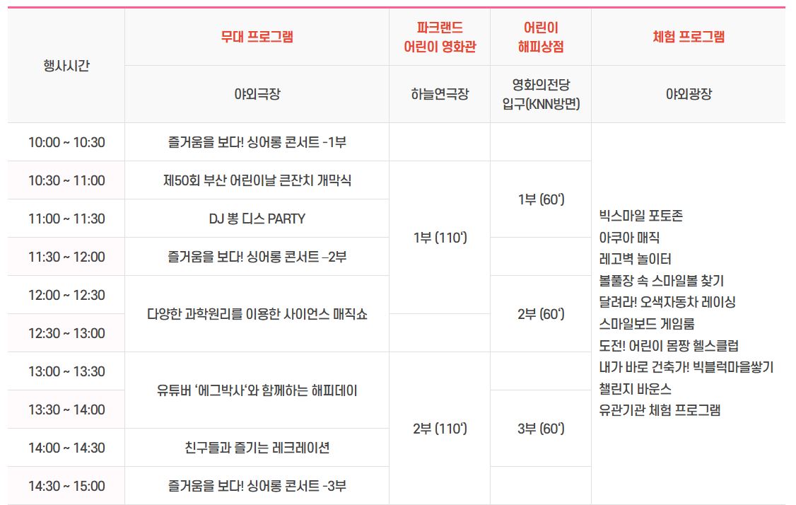● 행사내용 : 파크랜드 어린이 영화관, 캐리와 친구들 싱어롱 콘서트, 유튜버 에그박사와 함께 하는 해피데이, 시나는 DJ 봉 디스 파티 등