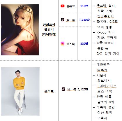 □ 메가 인플루언서 ▴카리모바 엘리나(리나대장)(틱톡 구독자 1,330만) ▴온오빠(틱톡 구독자 2,120만) ▴DJ소다(페이스북 팔로워 1,048만) ▴크리스텔 풀가(Kristel Fulgar, 유튜브 구독자 272만)등 4인을 ‘2023 서울콘 홍보대사’로 위촉
