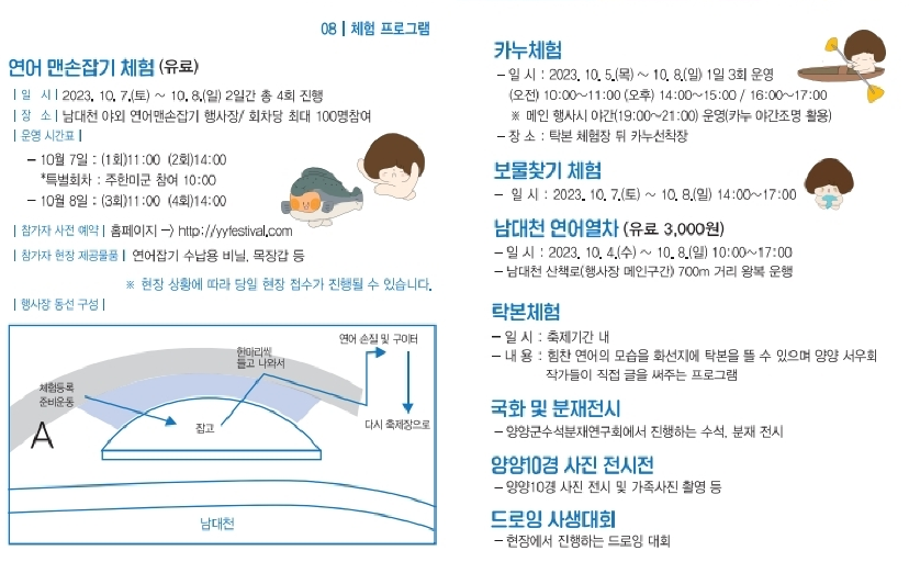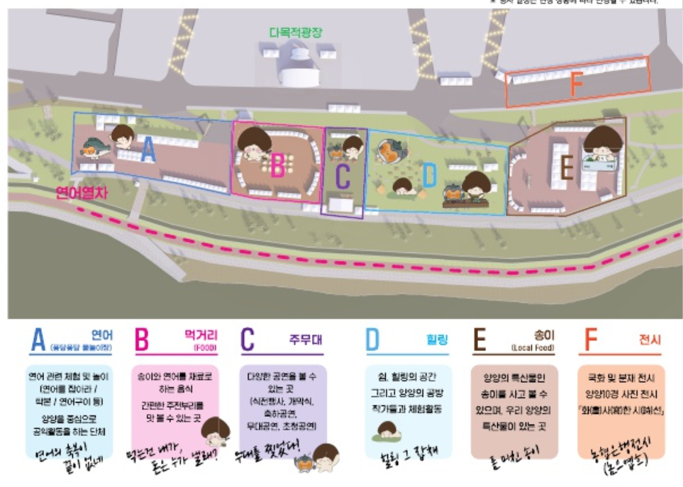 - 장소 : 양양 남대천 둔치, 다목적광장, 전통시장, 퐁당퐁당 물노이장