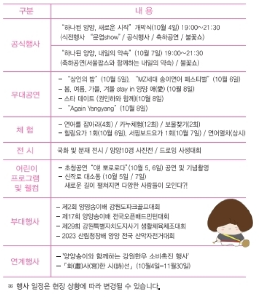 최초로 통합 개최되는 양양 송이연어 축제 개막식, 프로그램, 체험행사 등 일정 안내합니다.
