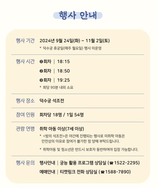 ‘밤의 석조전’ 행사는 ▲ 전문 해설사와 함께하는 석조전 내부 관람, ▲ 석조전 테라스 카페 체험, ▲ 대한제국 시기의 이야기를 담은 창작 뮤지컬 관람 등으로 구성된 덕수궁 야간 체험 프로그램입니다. 특히, 석조전 2층 테라스에서 진행되는 카페 체험은 서양식 후식과 음료를 즐기며 덕수궁의 야경을 감상할 수 있어 많은 관람객들로부터 높은 인기를 끌고 있습니다.
