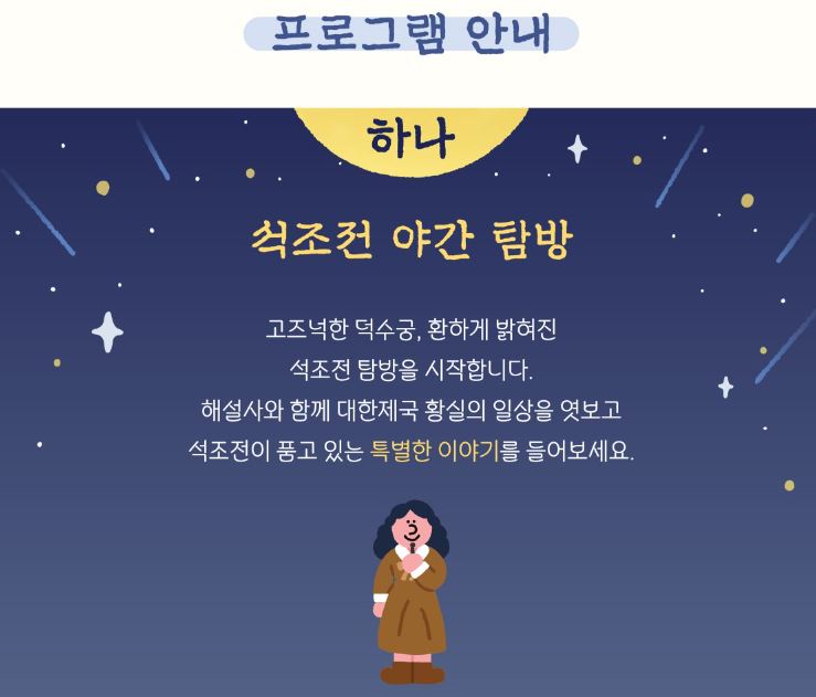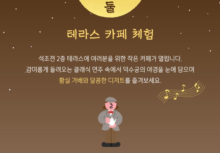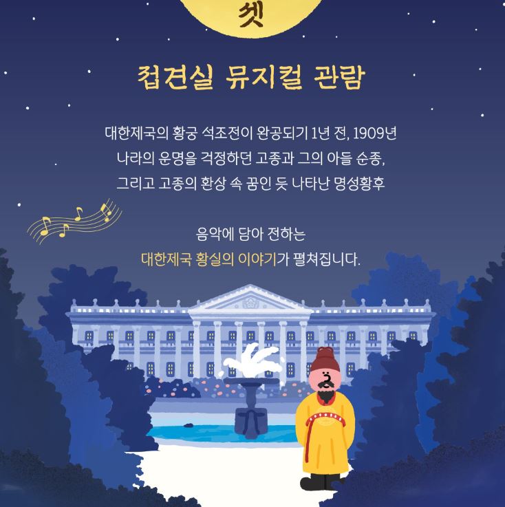밤의 석조전은 전문 해설사와 함께하는 석조전 야간 탐방, 고종이 사랑했던 가배차(커피)와 디저트를 음미하는 테라스 카페 체험, 귀빈을 맞이했던 접견실에서 감상하는 대한제국 배경 창작 뮤지컬 공연이 결합된 덕수궁 야간 체험 프로그램입니다.
