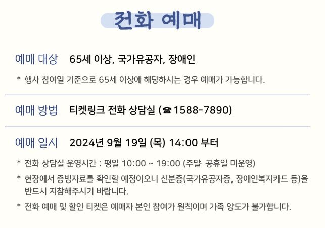 1인당 참가비는 2만 6,000원이며, 만 65세 이상, 장애인, 국가유공자 분들께서는 9월 19일 오후 2시부터 전화 예매(1588-7890)를 통해 선착순으로 예약하실 수 있습니다.