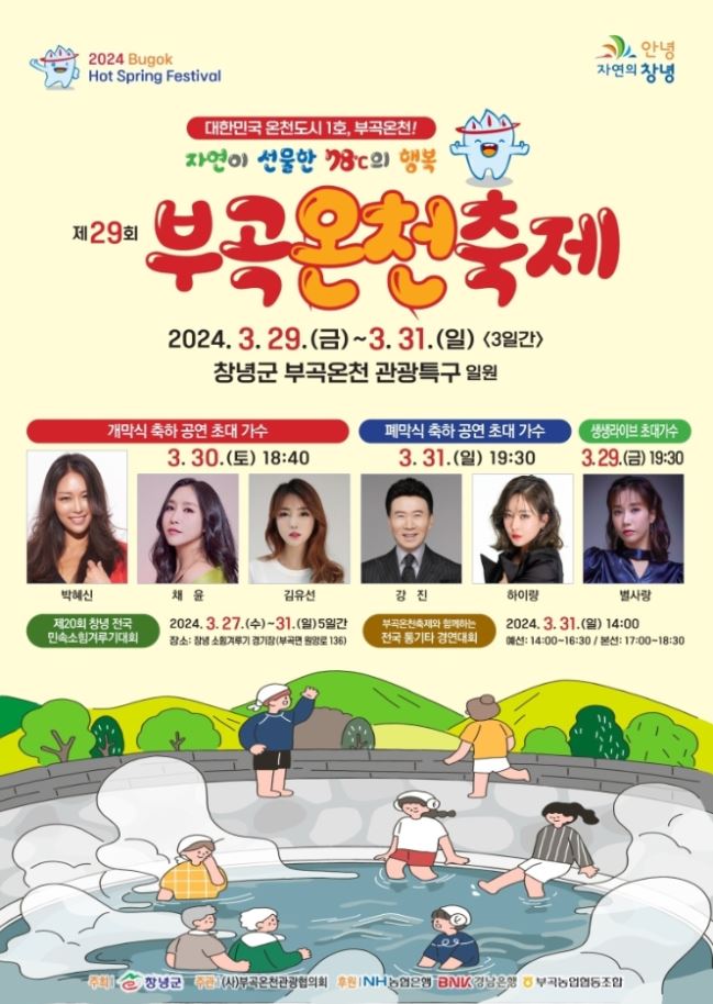 제29회 부곡온천축제가 78℃ 전국 최고의 수온 부곡온천관광 특구에서 2024. 3. 29.(금) ~ 3. 31.(일) 3일간 개최됩니다. 초대가수는 박혜신, 채윤, 김유선, 강지, 하이량, 별사랑입니다.