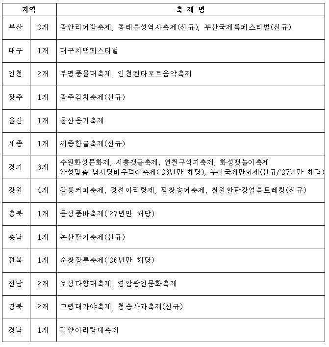 부산은 광안리어방축제, 동래읍성역사축제(신규), 부산국제록페스티벌(신규) 등