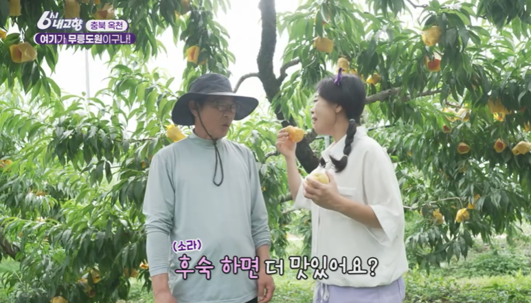 청량감을 더해줄 복숭아 화채 복숭아 주스까지 고향에 복스러운 복덩이 미녀는 복숭아를 좋아한다고 자타공인 미녀 리포터인 저도 복숭아 맛에 빠져들더라고요. 아삭하면서 또 약간 새콤하면서 달콤하면서 풋풋한 달콤함이 있어요. 부부의 복숭아 농사 경력 25년 내공이 깃든 맛이니 더욱 특별할 수밖에요. 아니 거의다 타신 거예요. 진짜 기분이 좋아요. 지금 뭐 고민 좀 했는데 타여도 진짜 웃을 수 있어요.