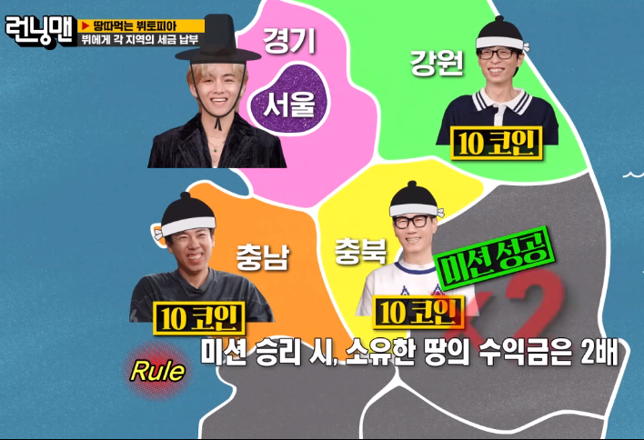 전국 10개의 땅을 소유한 지주 뷔는 땅부자이고 그 땅을 관리하는 소작인들 런닝맨들입니다.
