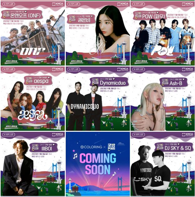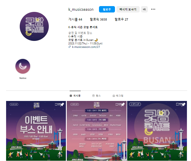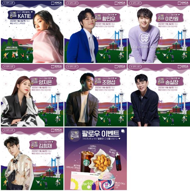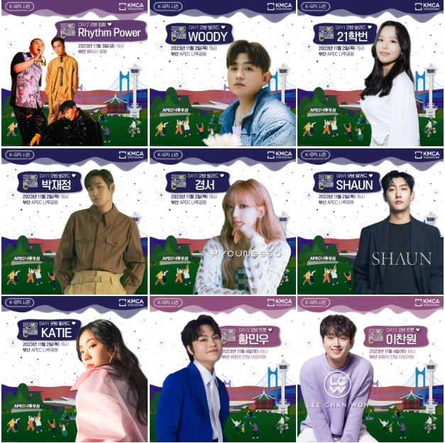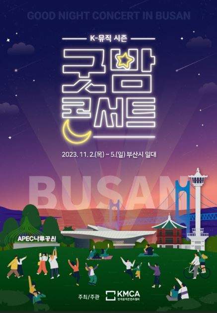 2023년 11월 2일(목)부터 5일(일)까지 부산시 일대(APEC 나루공원, 용두산 공원, 영화의 전당 야외극장)에서 개최되는 2023 K-뮤직 시즌 ’굿밤 콘서트 in 부산’은 부산의 매력적인 장소와 음악이 만나, 아름다운 밤을 만들어가는 뮤직 콘서트입니다.