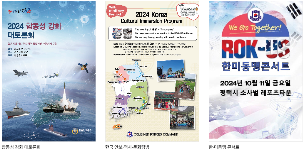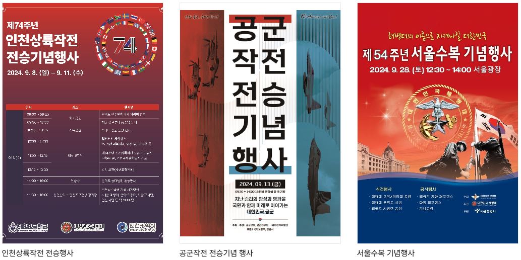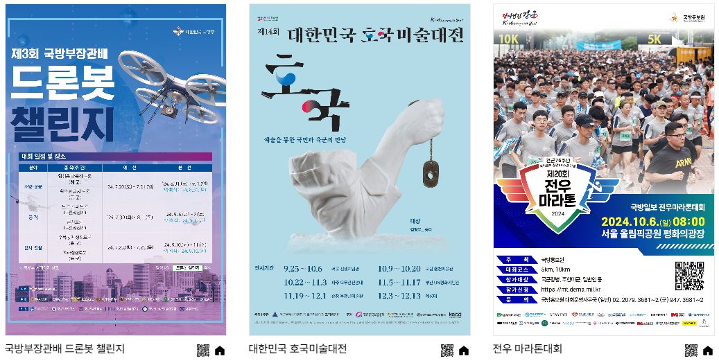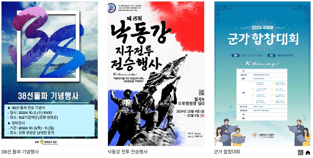 인천상륙작전 전승행사 / 공군작전 전승기념 행사 / 서울수복 기념행사 / 38선 돌파 기념행사 / 낙동강 전투 전승행사 / 군가 합창대회 / 민·군화합 서바이벌 경연 / 스페이스 챌린지 2024  / 국방부장관기 태권도 대회 / 국방부장관배 드론봇 챌린지 / 대한민국 호국미술대전 / 전우 마라톤대회 / 군인가족의 날 기념행사 /용산 문화 페스타 / 국군의 날 기념음악회