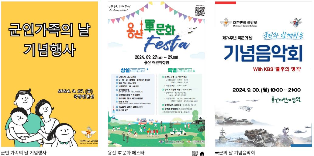 우리 국민이 군(軍) 문화를 체험할 수 있는 행사로는 9월 27일부터 29일까지 용산에서 군 문화 페스타가 용산 어린이정원에서 진행됩니다.    ◦용산 군 문화 페스타는 미래 세대인 어린이, 청소